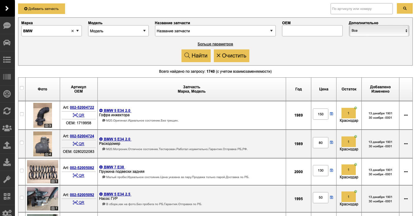 Ведение базы автозапчастей, автоматическое обновление и выгрузка ваших прайсов, QR коды, взаимозаменяемость, складской учет, аналитика,разделение доступов.